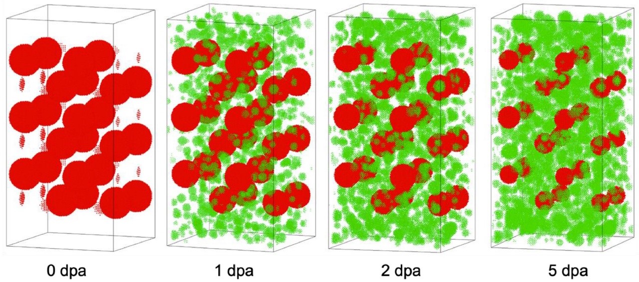 Heating and cooling inside an operating reactor takes place in picoseconds, or one trillionth of a second. During this heating and cooling, the material will re-solidify, but will leave defects behind, Jiang said. “These residual defects will migrate and accumulate to form large-scale defects in the long run.”