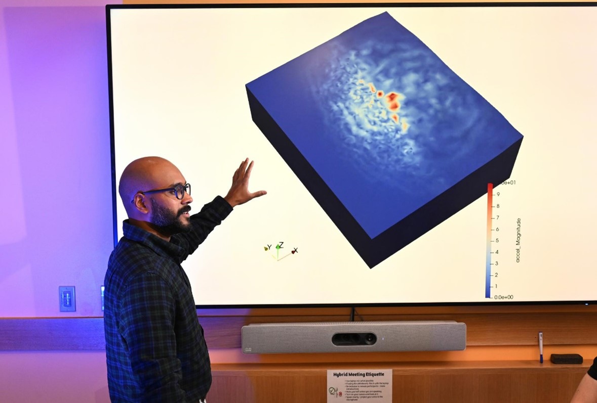 Bolisetti, who leads the lab’s Facility Risk Group, uses high performance computing to simulate the effects of seismic waves — the shaking that results from an earthquake — on energy infrastructure such as nuclear power plants or dams.